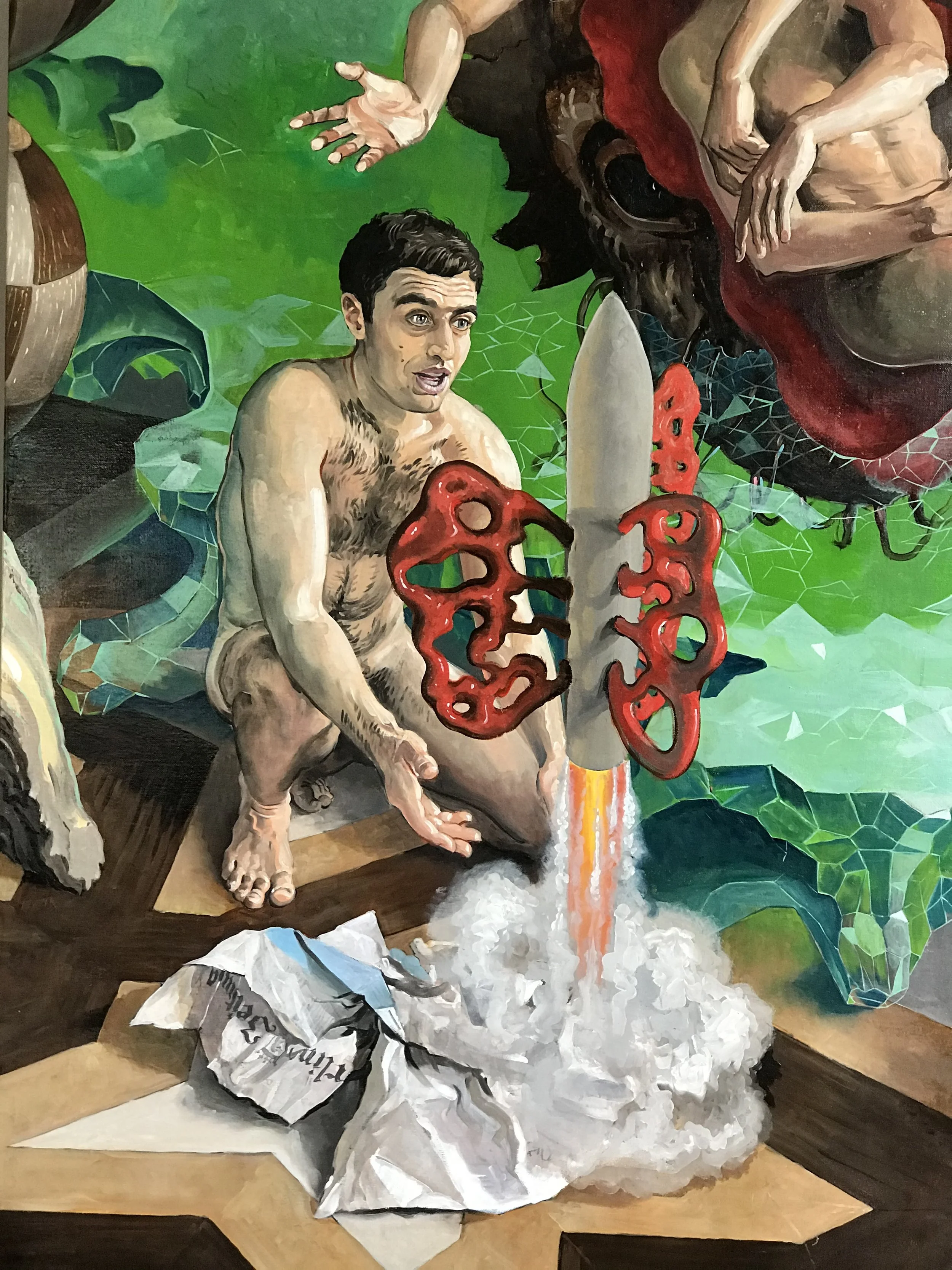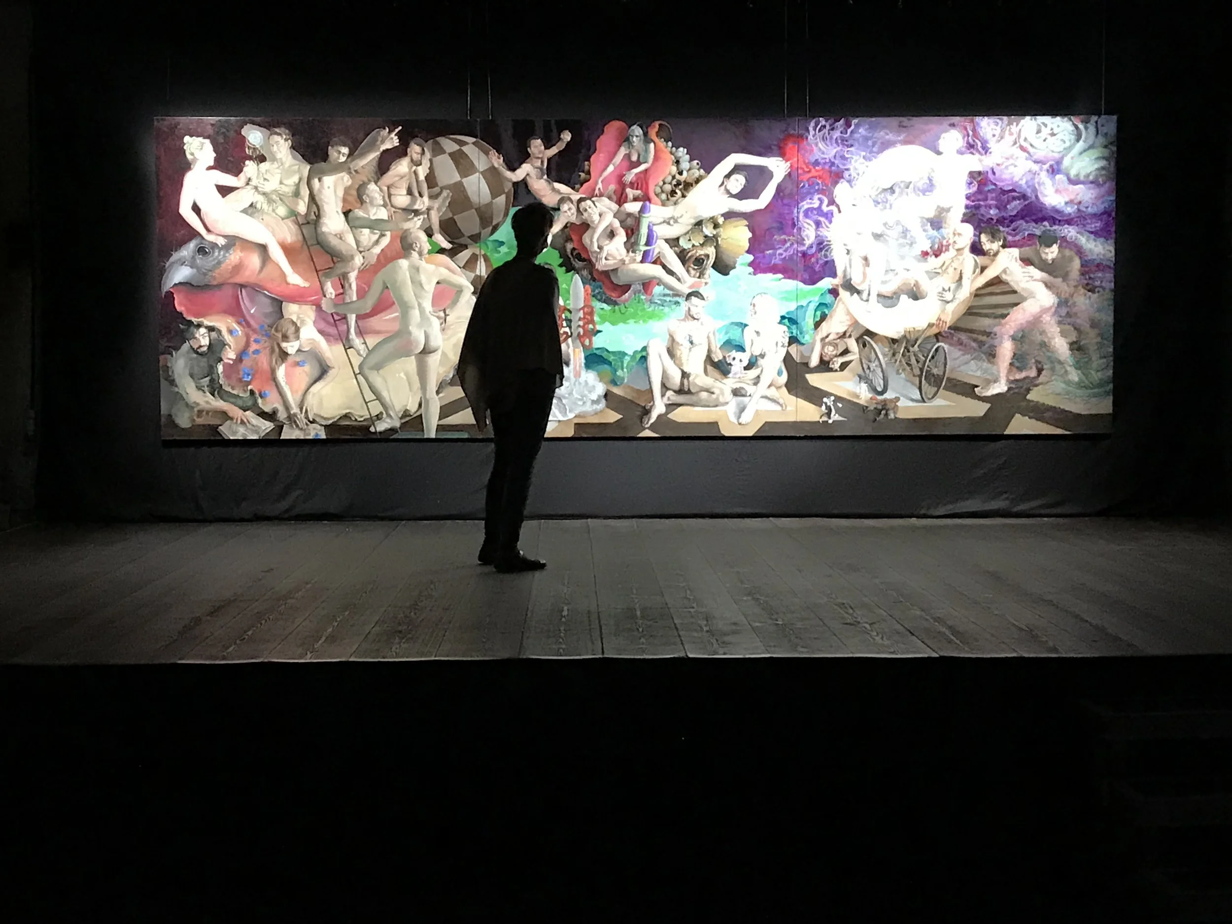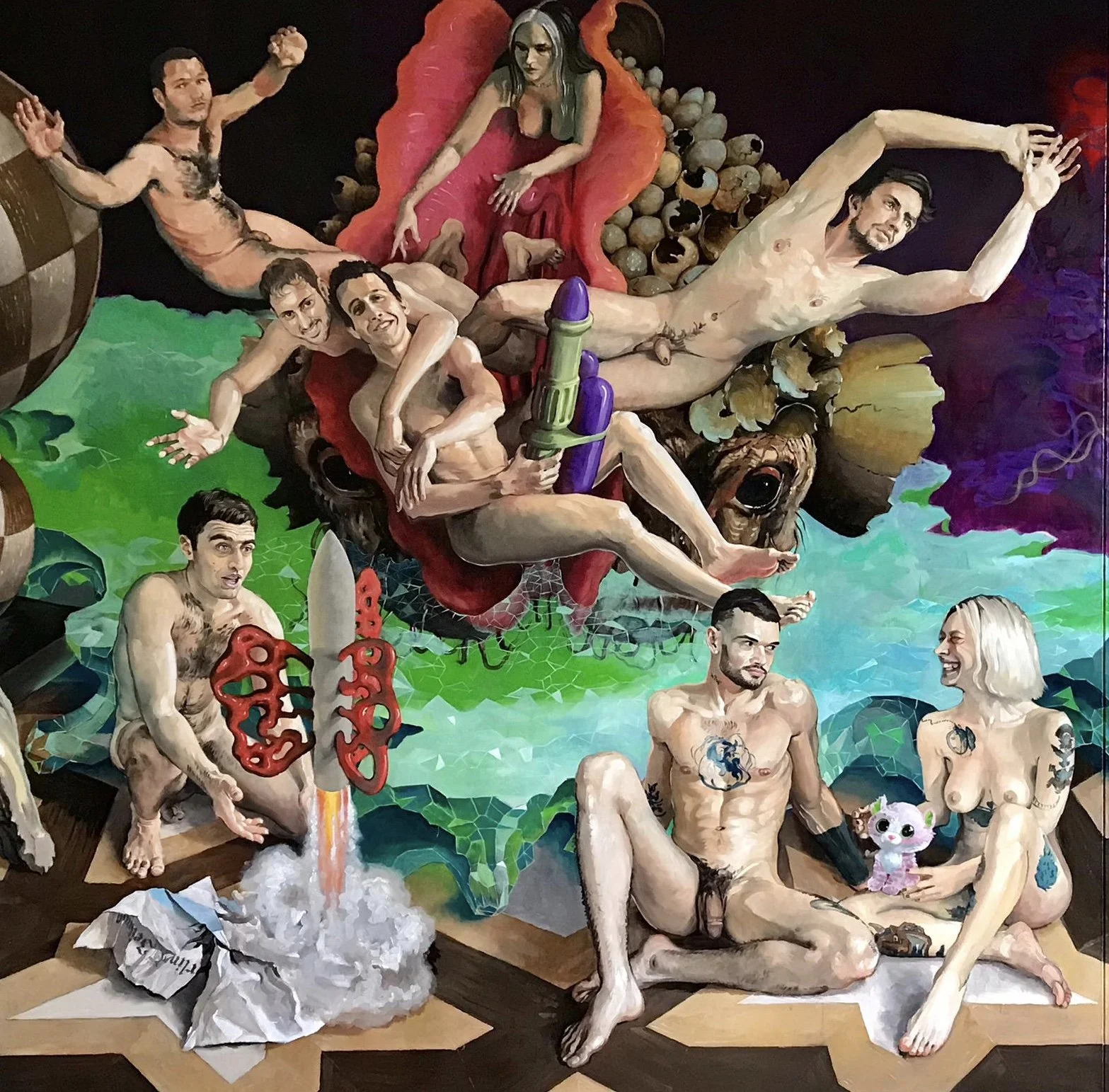 2020 a delightful invitation to surreal, fantastical composition came in the form of a commission from a company specializing in computer art and animated digital advertising. 22 employees of the company wanted to be portrayed nude together in a free composition. The painting was intended to serve as a background image in the company’s party pavilion during their appearances at international trade fairs, providing the backdrop for exclusive events with invited guests.