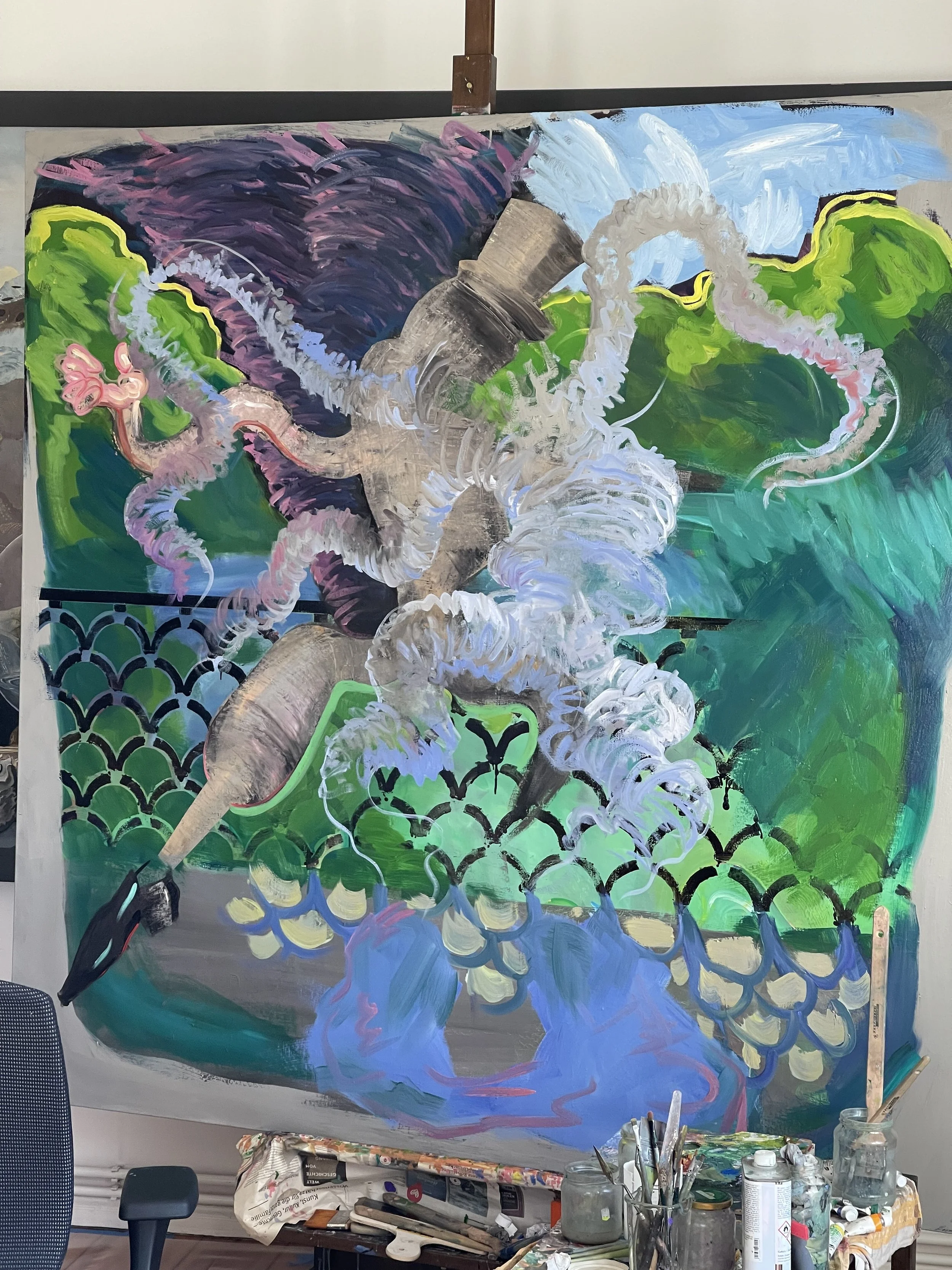 The patriarch’s ponds give name to a small park in the center of Moscow. It is the place where Mikhail Bulgakov sets the fantastic events of his novel The Master and Margarita in motion. Behemots first appearance is the theme that was chosen here. With this the first canvas of the above triptych, SELAM X Teil 1 was overpainted.