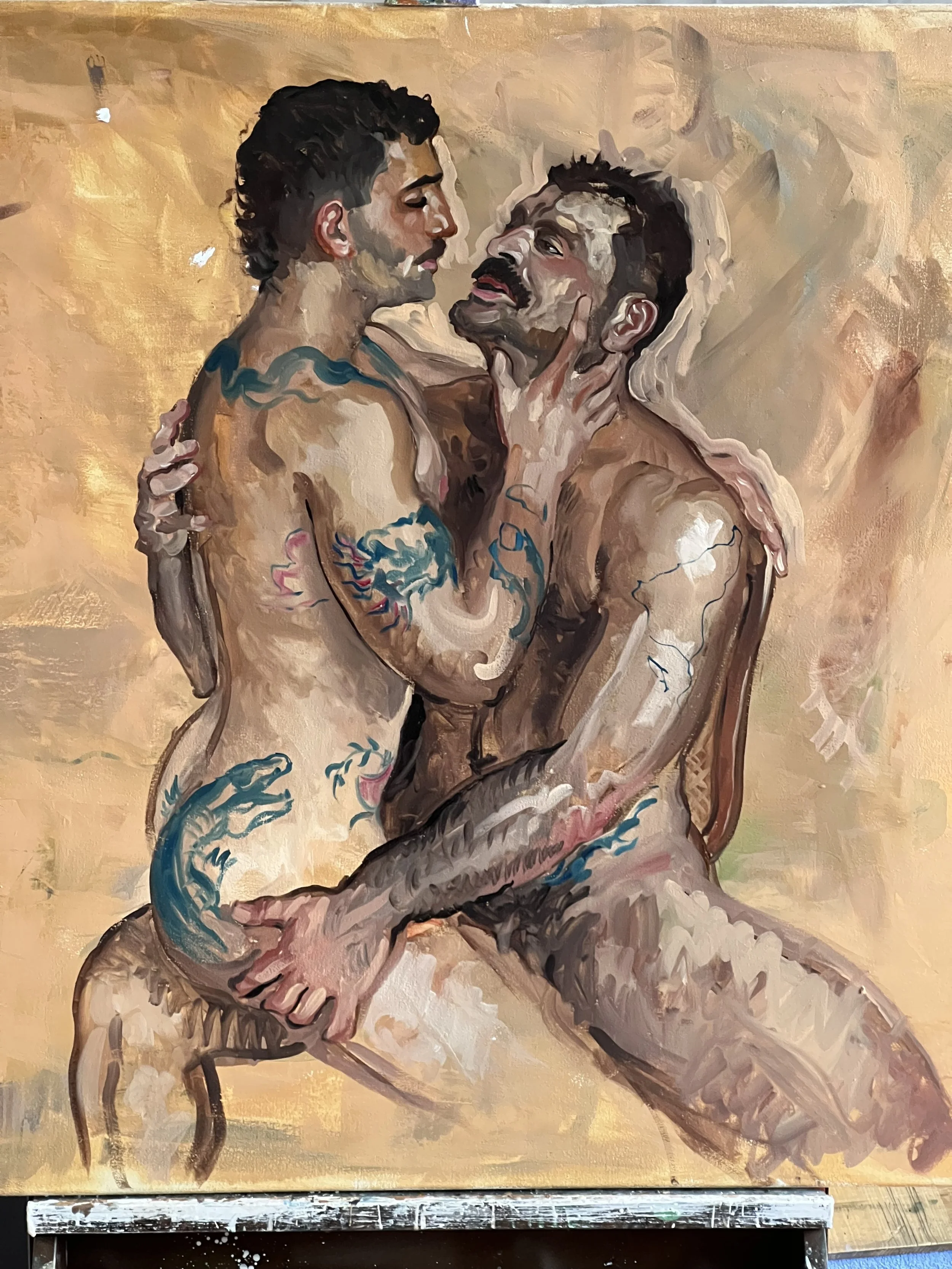 Oil sketch within two sessions with the models. No pre drawing on the canvas.