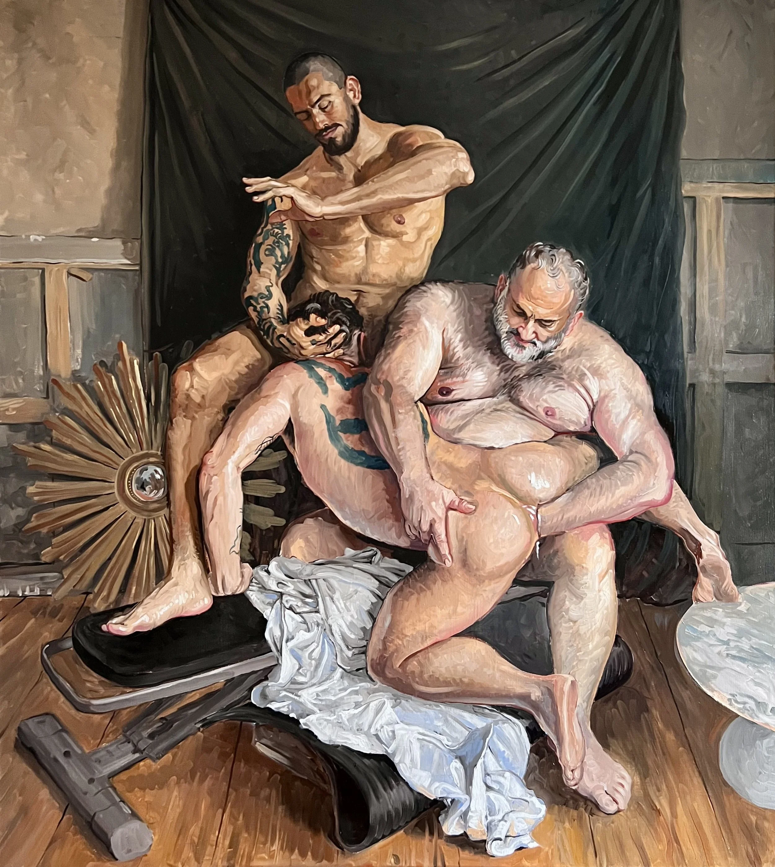 Three models engaging in a fisting scene at the atelier. The work was carried out during four sessions with the models.